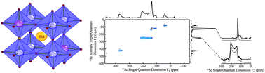 A comprehensive multinuclear solid-state NMR study of scandium-substituted BaZrO3 is reported. Static low field and MQMAS very high field 45Sc NMR data revealed the presence of both 5- and 6-coordinated scandium atoms, 5-coordinated scandium arising from Sc nearby an oxygen vacancy. 17O NMR spectra showed the presence of up to three different chemical oxygen environments assigned to Zr–O–Zr, Zr–O–Sc and Sc–O–Sc. From the ratios of these different oxygen sites, the distribution of the scandium cations was close to random but indicated that the maximum scandium incorporation was lower than expected, consistent with the observation of Sc2O3 impurities at substitution levels of 30% Sc for Zr. 1H and 45Sc NMR data on the hydrated materials revealed the presence of scandium next to protonic defects. Finally, variable temperature 1H NMR showed the presence of at least two different proton environments in between which proton transfer occurs at ambient temperatures (300 K).